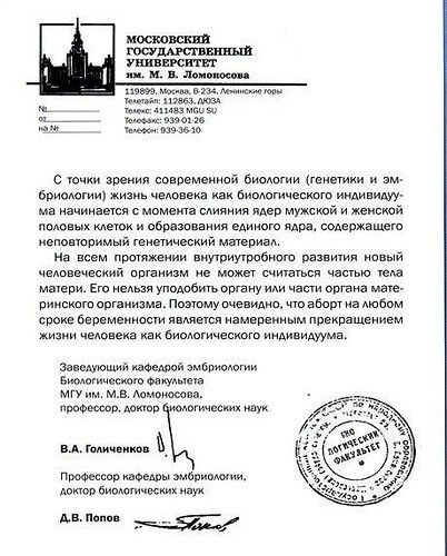 Заведующий кафедрой эмбриологии биофака МГУ В.А. Голиченков и профессор кафедры Д.В. Попов официально заявили, что жизнь человека начинается с момента зачатия.