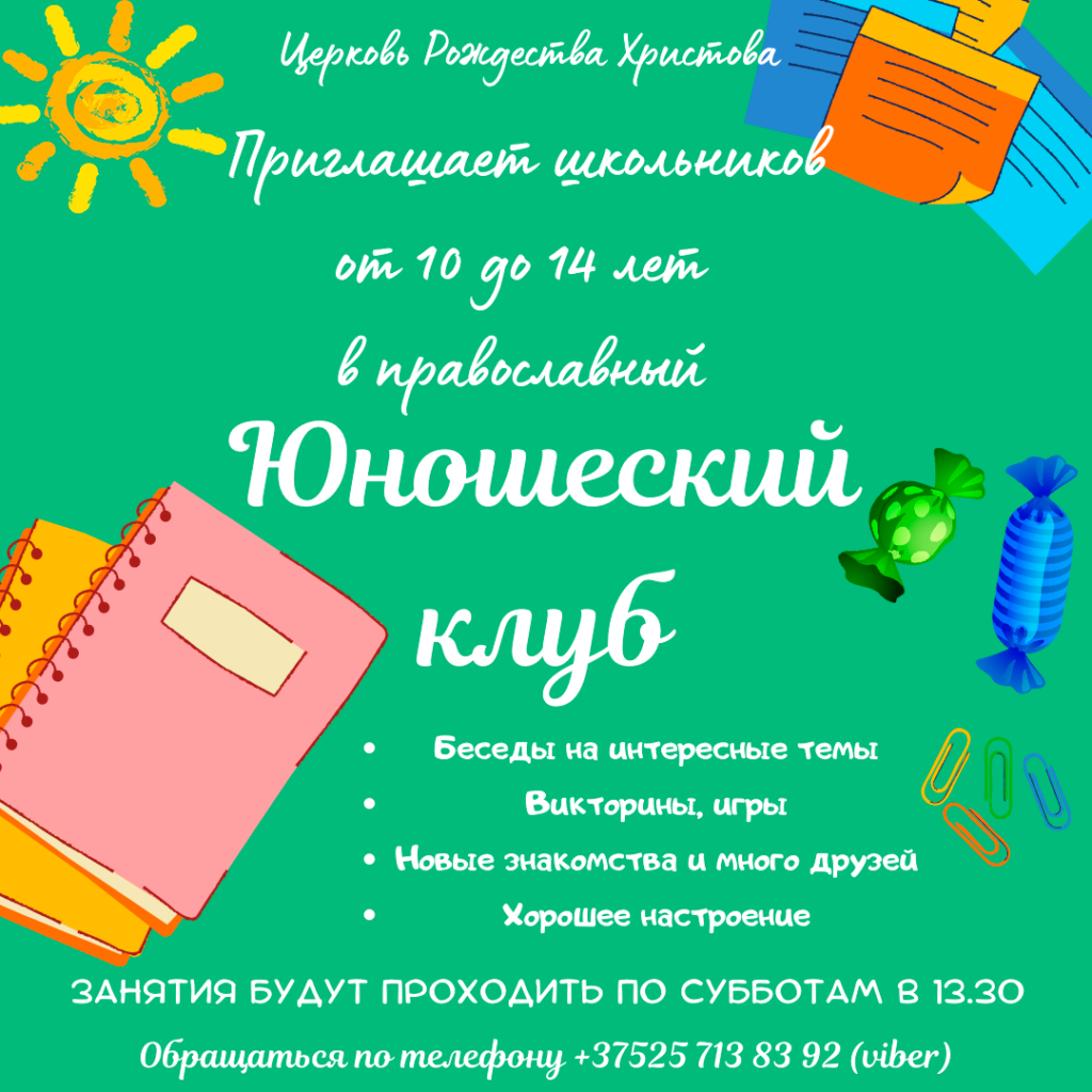 Православный Юношеский клуб приглашает всех ребят от 10 до 14 лет, а также  выпускников Воскресной школы. На занятиях будут проходить беседы на интересные православные темы, викторины, игры, совместное общение с чаепитием, праздники, просмотр и обсуждение интересных фильмов в основе которых доброта, милосердие, поучительный смысл.